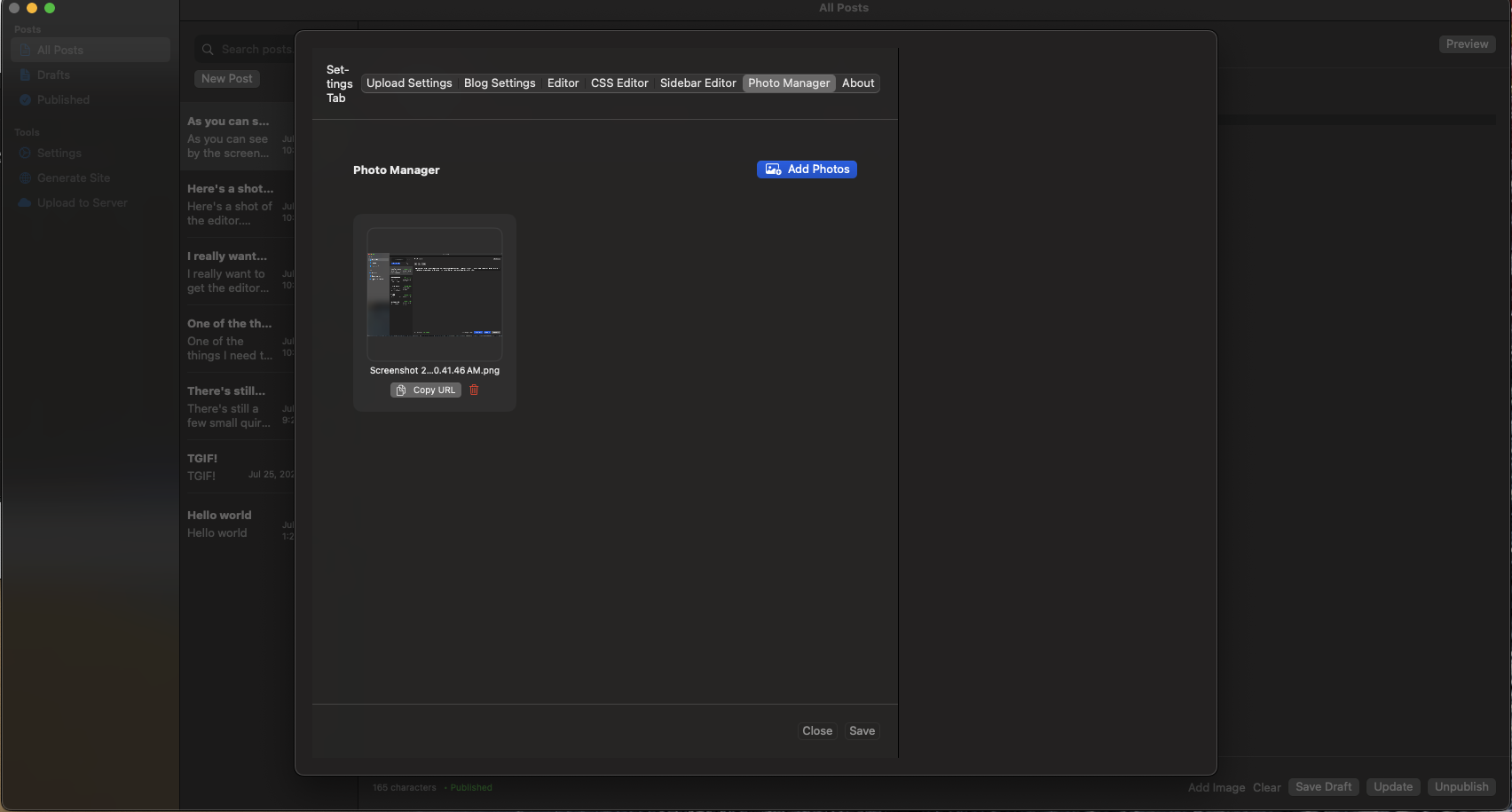 The settings panel allows you to not only configure your ftp/sftp and blog settings, but also upload photos, edit the sidebar (in html for the moment) and edit your static site's css stylesheet.